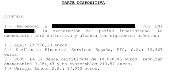 El dato clave está en el tratamiento de la deuda pública. En este caso, el juzgado permite la exoneración de más de 27.000 euros con la Agencia Tributaria y prácticamente la totalidad de la deuda con la Seguridad Social, algo que hasta hace pocos meses resultaba muy difícil de conseguir en la práctica.